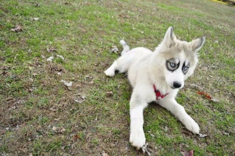 11. This Husky pup is definitely unique. Typically black and white all over, this sweet dog is mostly white. It's unclear whether this is a mixed dog or a purebred.