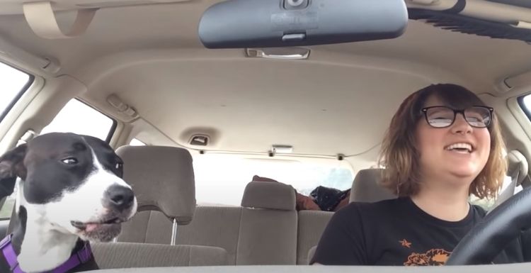 Mom plays percussion on the steering wheel and tries to get a note in edgewise, but her four-legged buddy has center stage.