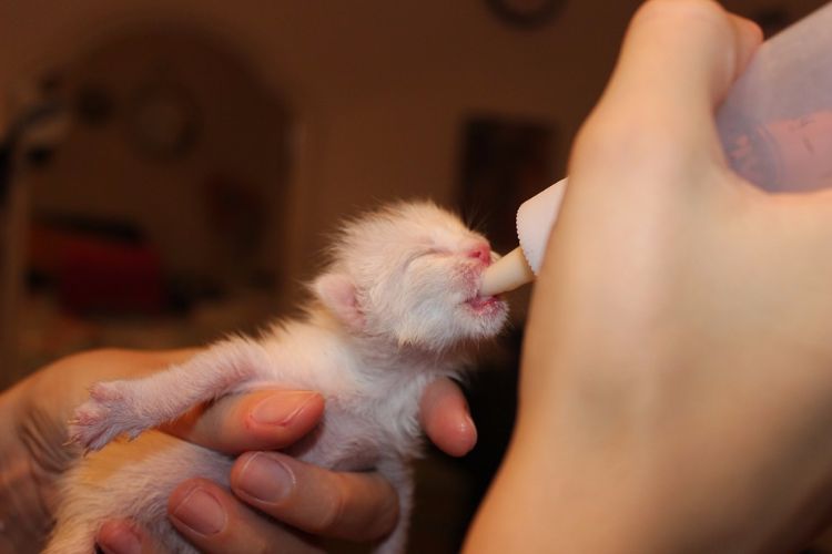 Shelters often have kittens or puppies who are unable to nurse because their mother is not with them or the mother cat is too weak to nurse. Volunteers at the shelter use baby bottles to feed these animals.
