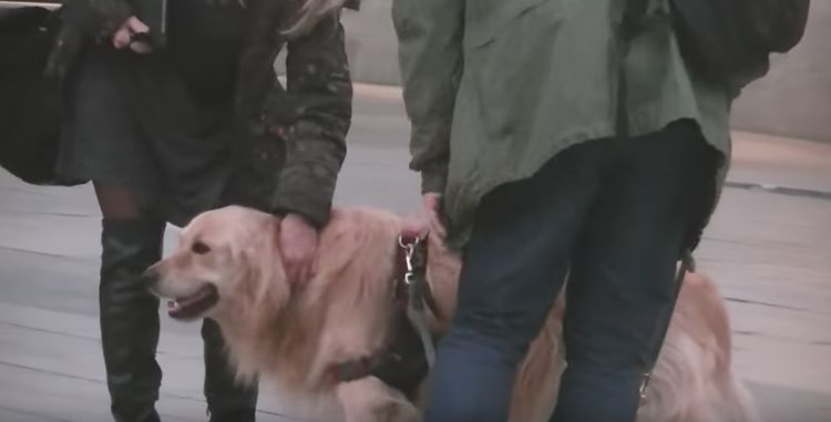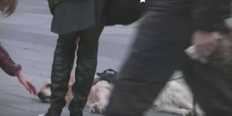 As the owner gives up and stands waiting for the dog to change his mind, people start paying attention to the beautiful animal.