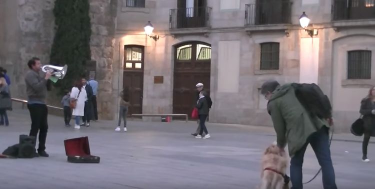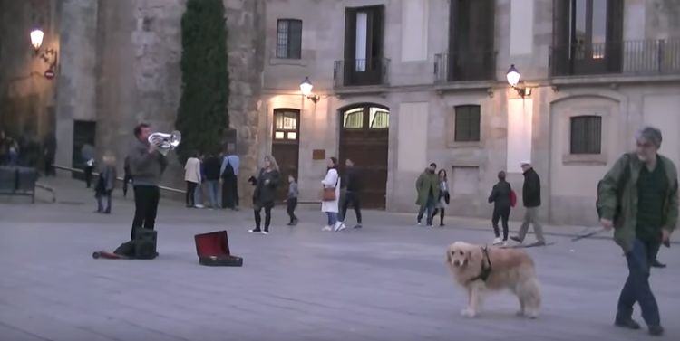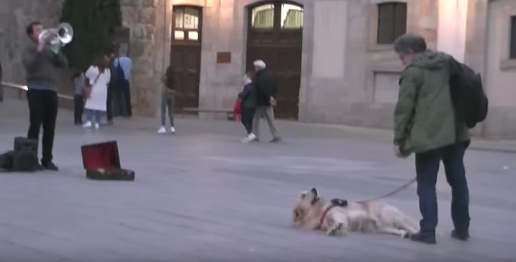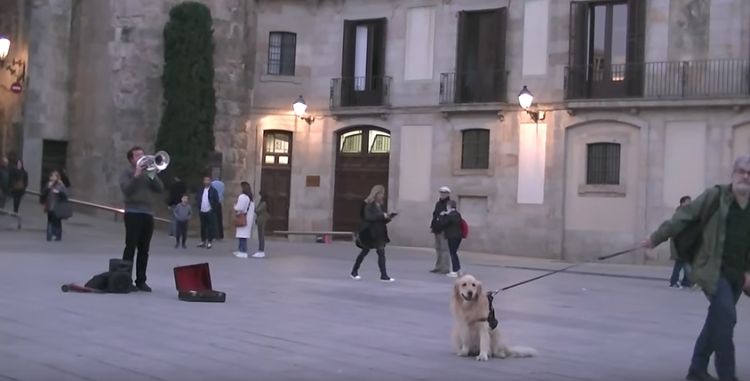 In the video below, a person recording a melody being played on a tuba gets a bit of drama in his movie when someone strolls into the frame with his beautiful Golden Retriever.
