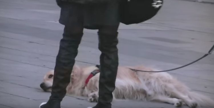 His owner tries one more time, but the dog insists on staying by lying down on the ground. What’s he going to do? That’s a heavy dog to try to drag!