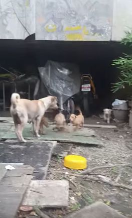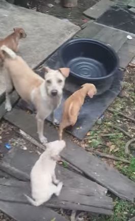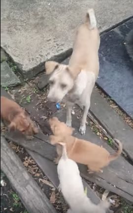 Mama dog dropped the chicken for her little ones to eat, not taking any for herself. The pups quickly devoured the meat and then, as though knowing where it came from, they went to the man with the camera to see if he had more.