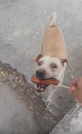 For the second time that day, this dog had come begging for food. The first time, tantalized by the delicious smells of the grilled chicken, she accepted the offering and trotted away. But the second time she came begging, the photographer decided to follow her and see what she was up to.