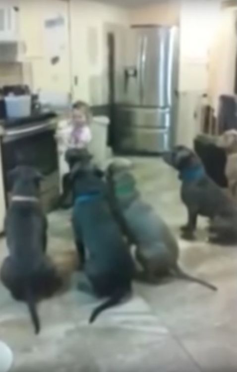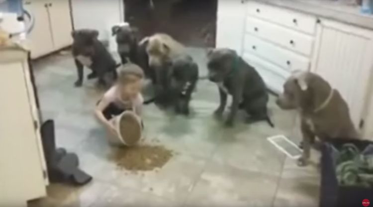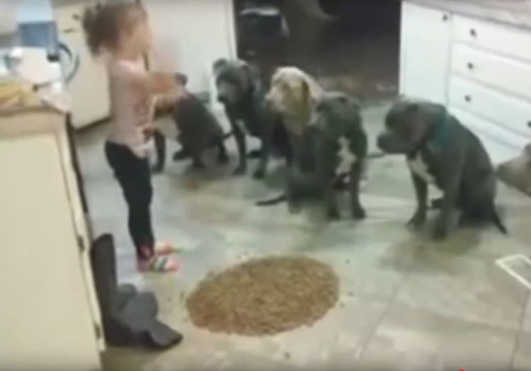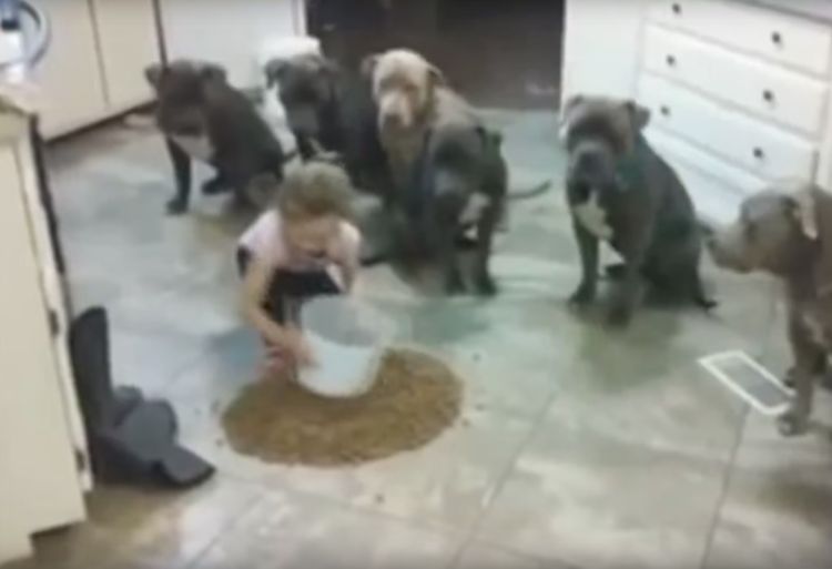It’s feeding time, and the little girl is tasked with feeding the dogs and making sure they behave. Would you ask your four year old to take on this job?