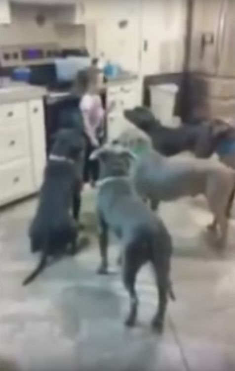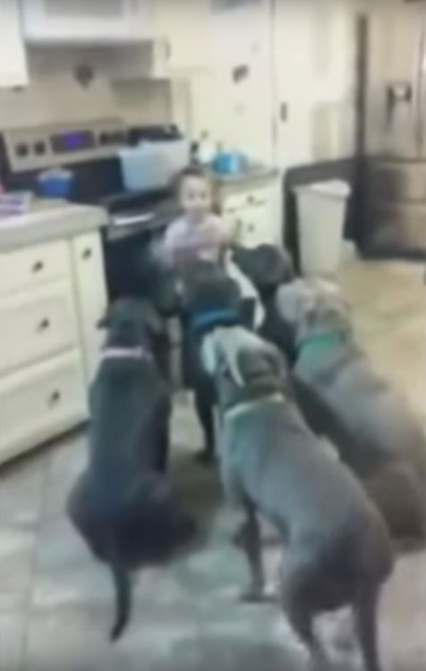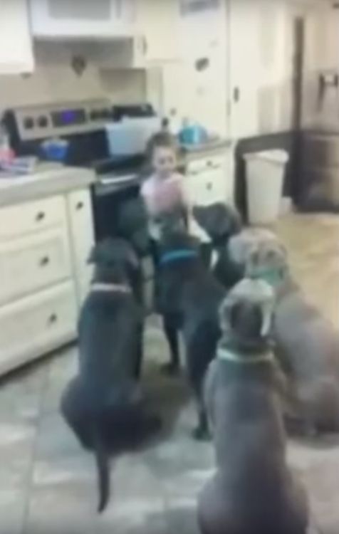 Six full-grown, male pit bulls calmly gather ‘round to have their meal, while the little girl dances around behind them.