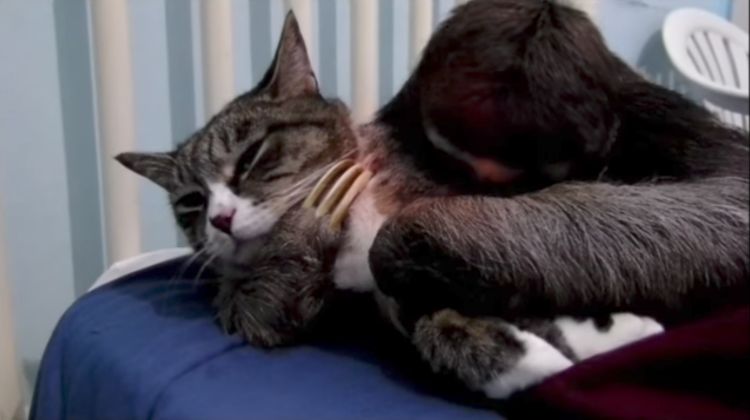 Daisy, the tabby, seems content to lie in Prince’s arms and let him gently scratch her head. A lot of the time, Daisy is completely hidden under Prince’s body as he hugs and pets her.