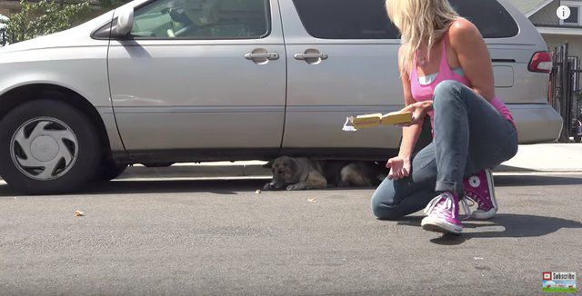 Then they found the dog, hiding underneath a vehicle. Not wanting to spook the dog but aware that they would need to take care in coaxing her out, Arturo gently tossed small pieces of food in the dog's direction. Once the dog caught a whiff of the food, she began to emerge from underneath the car slowly.
