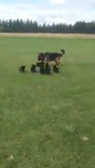 Sometimes Mom just needs to wear her little ones out so they'll calm down. But what would you do if you had this many little ones all demanding your attention at the same time? Might you feel like running away? Well, that's exactly what this mother German Shepherd did...kind of.