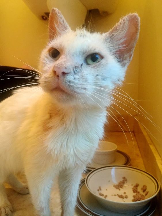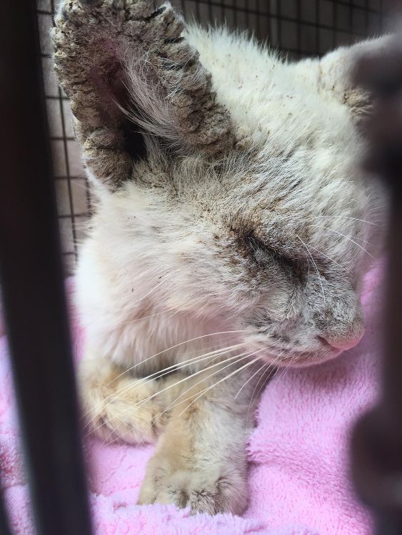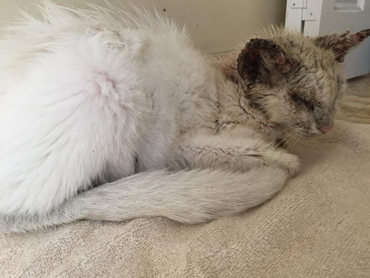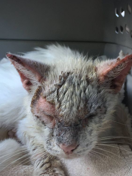 Out of the blue one day, a stray cat showed up at a house in Royal Palm Beach, Florida. The homeowner noticed the cat, but when he came in for a closer look, he was shocked by the animal's incredibly poor condition. The cat had mange and couldn't open its eyes because of all the crusting.