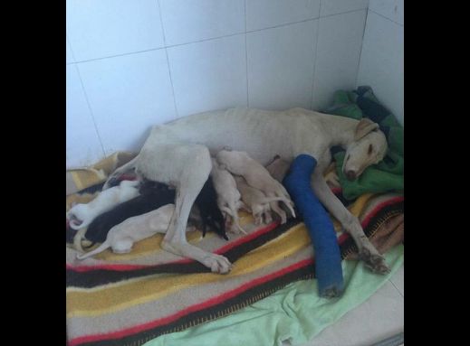 The elegant greyhound was found digging through garbage, looking for something to eat. She was limping badly, and once they got her to the clinic, they discovered a bad fracture in her right front leg. But something else they noticed in the emaciated dog couldn't be overlooked.