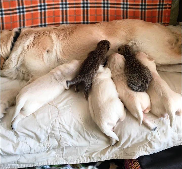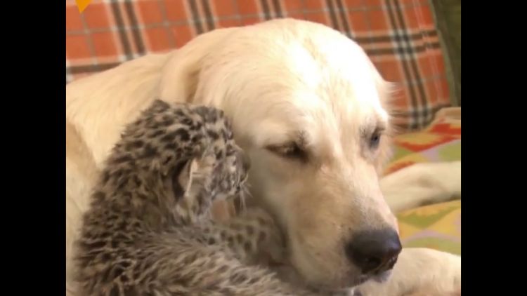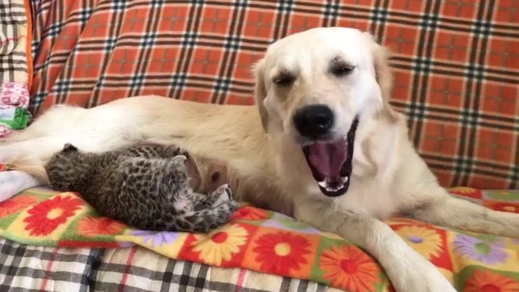Tessa, a golden retriever from Vladivostok, Russia, has her litter of four baby puppies to care for, but she is also a loving foster mom for a rare newborn Amur leopard cub from the Sadgorod Zoo. With a combination of rabbit meat, formula, and Tessa's milk and tender care, the little female cub is alive and well.