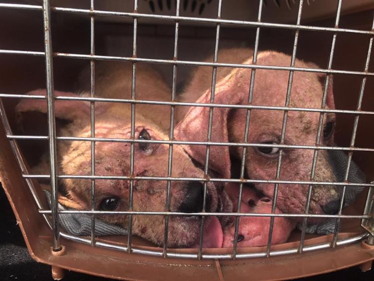 The two puppies were not at all what a man from Puerto Rico expected to find just a couple months ago. Their condition shocked him --- they were covered in scabs and painful sores --- and he feared that they would not live much longer in their dire state. In desperation, he took them home to try to nurse them back to health.