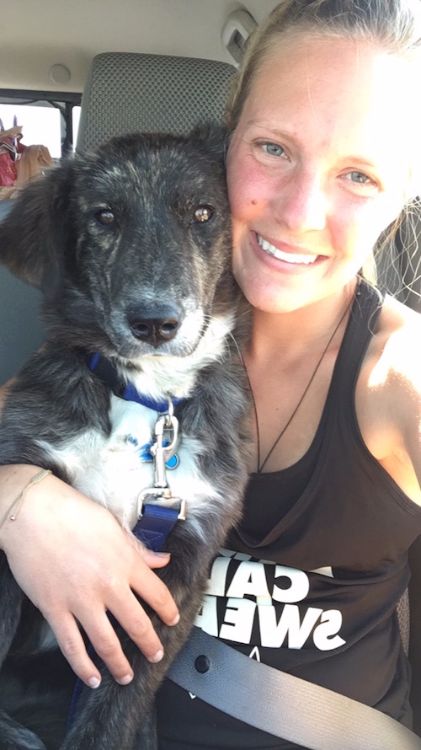 Actually, she didn't. They asked every patron at the gas station and even waited with her to see if someone who came out of the door would claim her. Eventually, a woman drove up in a car and told them to please, please adopt her. She was a stray that the woman had been feeding along with other dogs who lived on the street. So Nick and Emily opened their car door and let her in, intending to take her to a shelter in the next town.