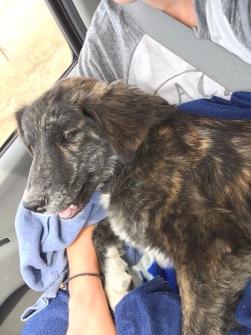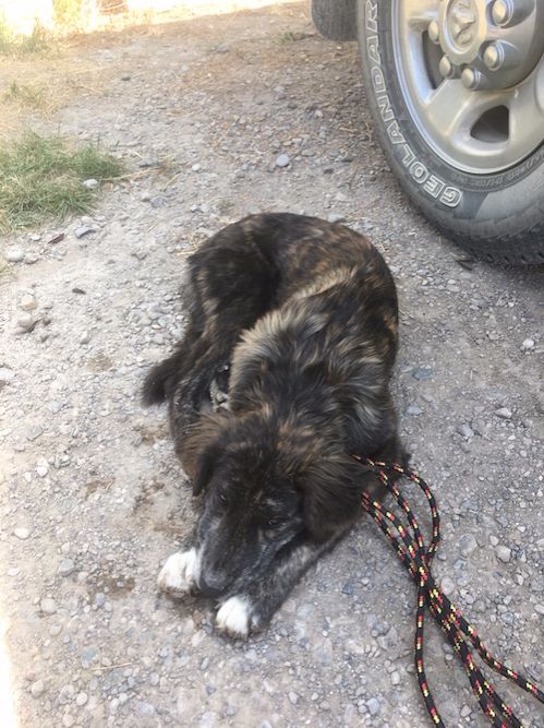 At the gas station where they stopped to fill up in the town of Browning, a pretty (if dirty) dog caught their attention. She was friendly and since both Emily and Nick liked dogs, they petted her. Surely, they thought, she belongs to someone here.
