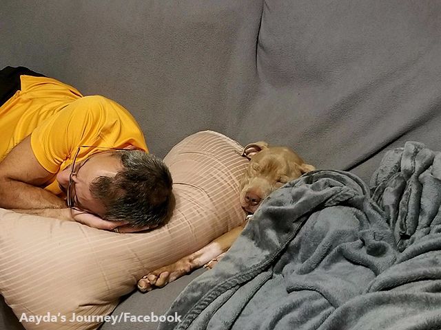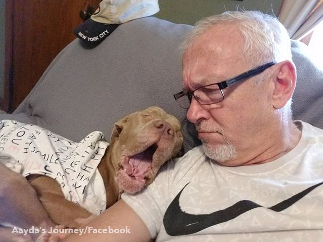 Not only was Aadya in bad physical shape, but her traumatic past left her shy of people, too. It took lots of love and cuddles to gain her trust, but she's come a long way under the care of Jeff and Mark.