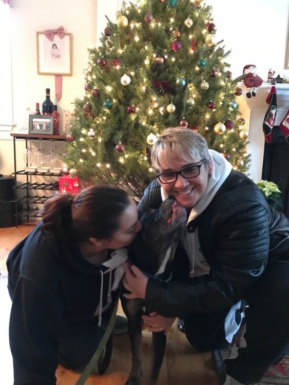 "She loves sleeping right between Jamie and me every night so far," Greene said. Bailey received pajamas for Christmas, but the best gift anybody at the Greene's house received this year was the gift of love. Love for a hapless pit bull who'd spent her whole life outside and love for the family—including Charlie—who took her in. What a joyous holiday!