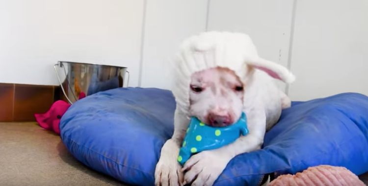 If you're a Pixar fan, you've probably seen Monsters, Inc, in which the hero is a giant, blue, fluffy monster named Skully. His job is to scare little kids in their sleep. But this Skully is a sweet, gentle pit bull mix who makes his home at one of the Best Friends Animal Society shelters, the largest no-kill animal organization in the nation. With his knitted hoods on, he doesn't look like the kind who makes kids scream—and he isn't!