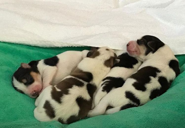 It's evident that they take after their daddy, whoever he is. Katie and John decided to go with the bovine theme and name the puppies Daisy, Betsy, Clarabelle, and Moo.