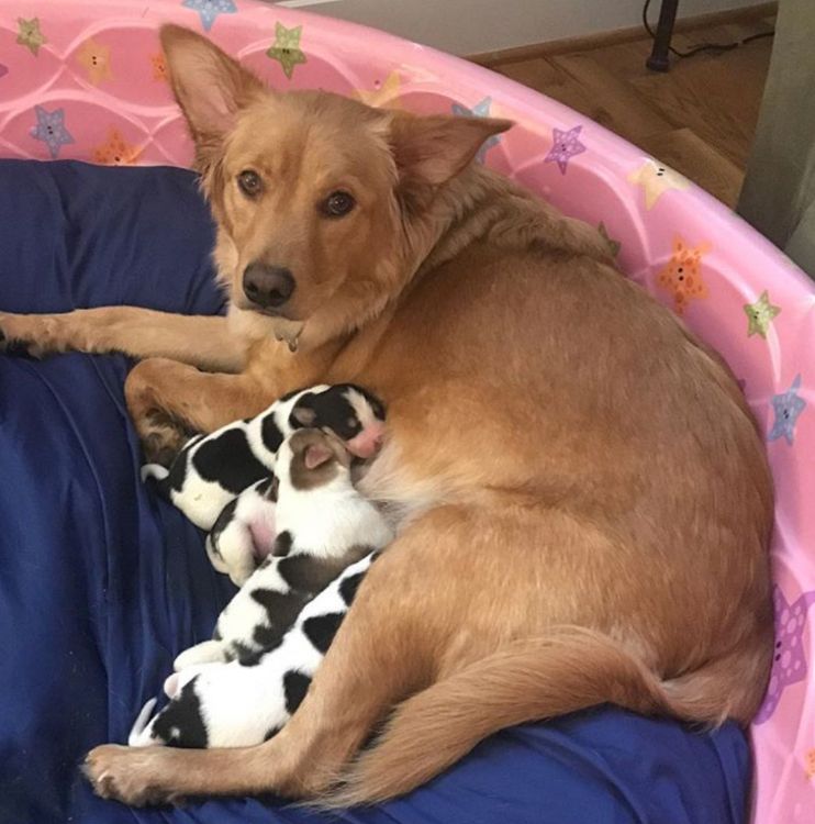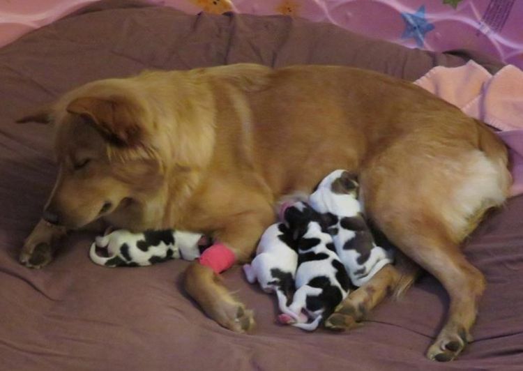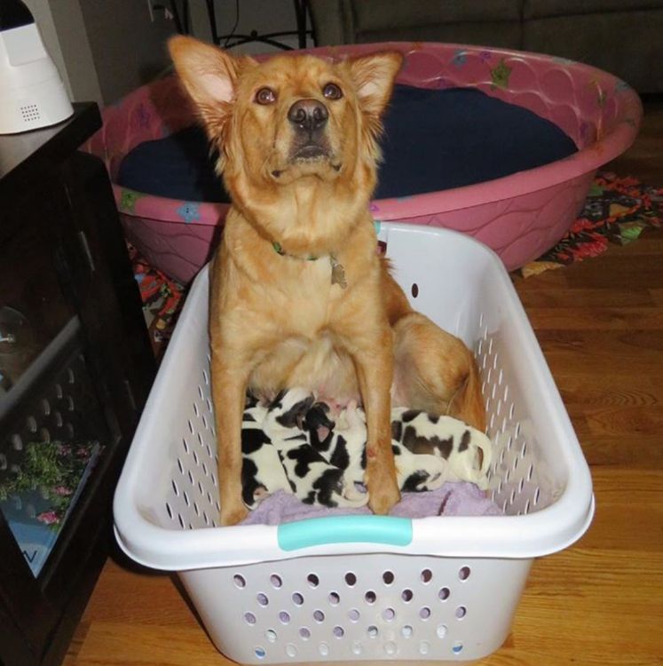Rosie is a Golden Retriever mix, so it was quite a surprise to her foster family when her babies turned out to look nothing like her. In fact, they thought the pups resembled cows more than a Golden Retriever's babies!