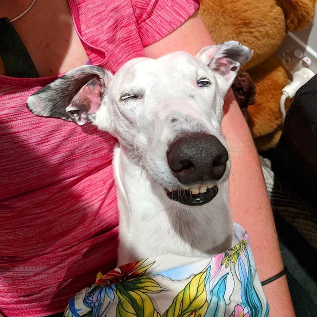 That's when Salty is happiest --- and when this sweet dog and her human-like teeth get all the attention! A trait that many greyhounds have is to express their happiness and contentment by chattering their teeth, and that's just what Salty does when she is out on the town.