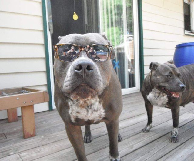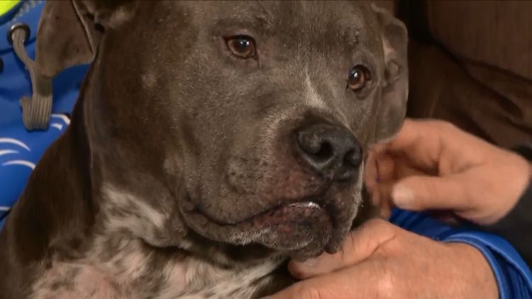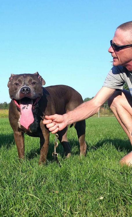 Roscoe is a sweet chocolate-brown pit bull from Parchment, MI. He's eight years old and weighs 85 pounds. Though he may look scary, he's just a lovable softy.