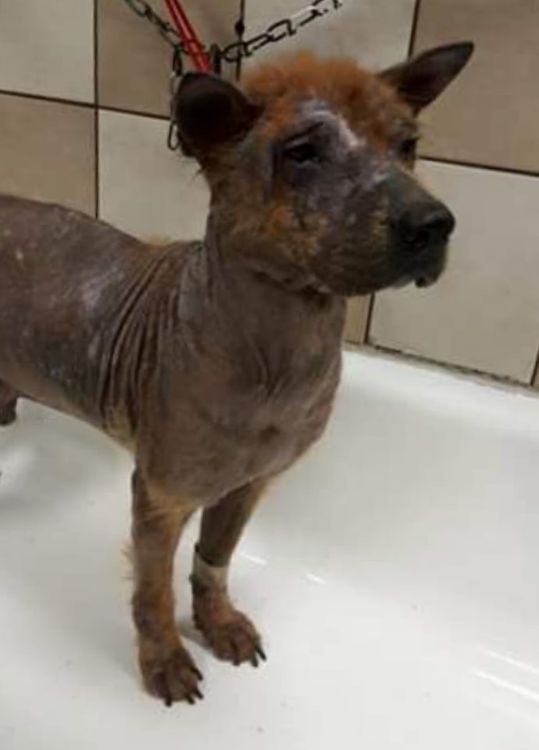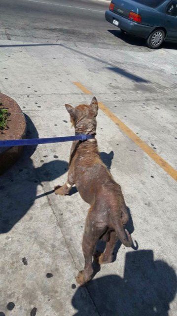 Just because he was found in Mexico and didn't have any hair does not mean that this dog is a Mexican Hairless. But exactly what he is was difficult to tell. When Karla Solis found him, he was terrified and crouching under a car in Tijuana. He was nearly completely bald and emaciated.