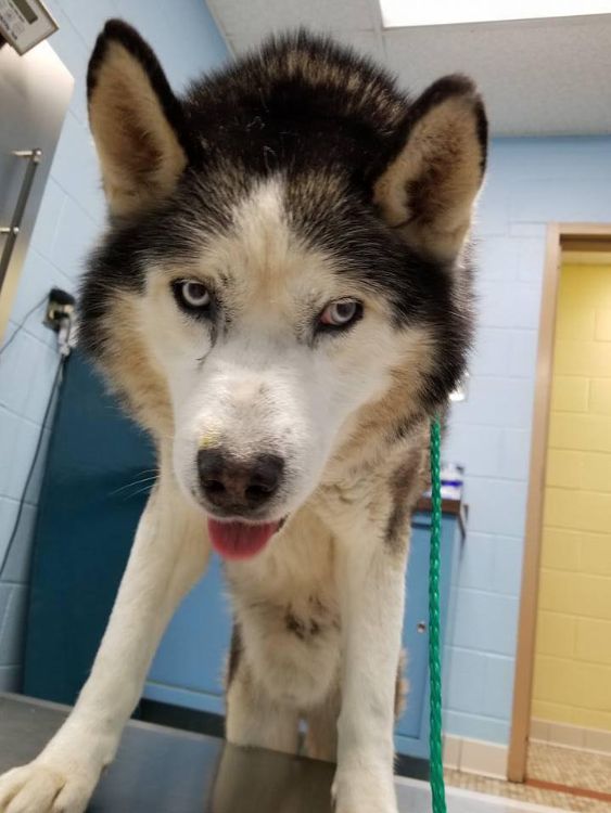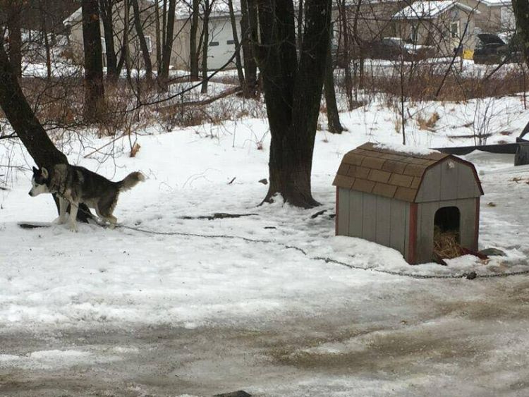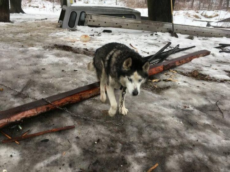 An emergency call went out concerning a home in New Philadelphia, Pennsylvania, when the roof collapsed on the rotted out house. It was there that someone noticed a senior husky tied on a chain in clear violation of the new law, known as Libre's Law, that states no dog should be left outside on a chain for more than thirty minutes at a time and can't be confined to an area full of waste. All this dog had was a small doghouse and a car roof for shelter, and the ground was littered with dog waste.