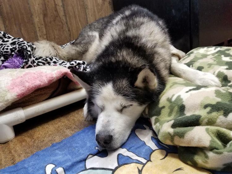 At the shelter, Cloud paced and slept, then woke up and paced again. Because he couldn't calm down within the shelter environment, Hillside SPCA contacted Eleanor Garrett of Senior Dog Haven and Hospice and asked her to foster the husky.