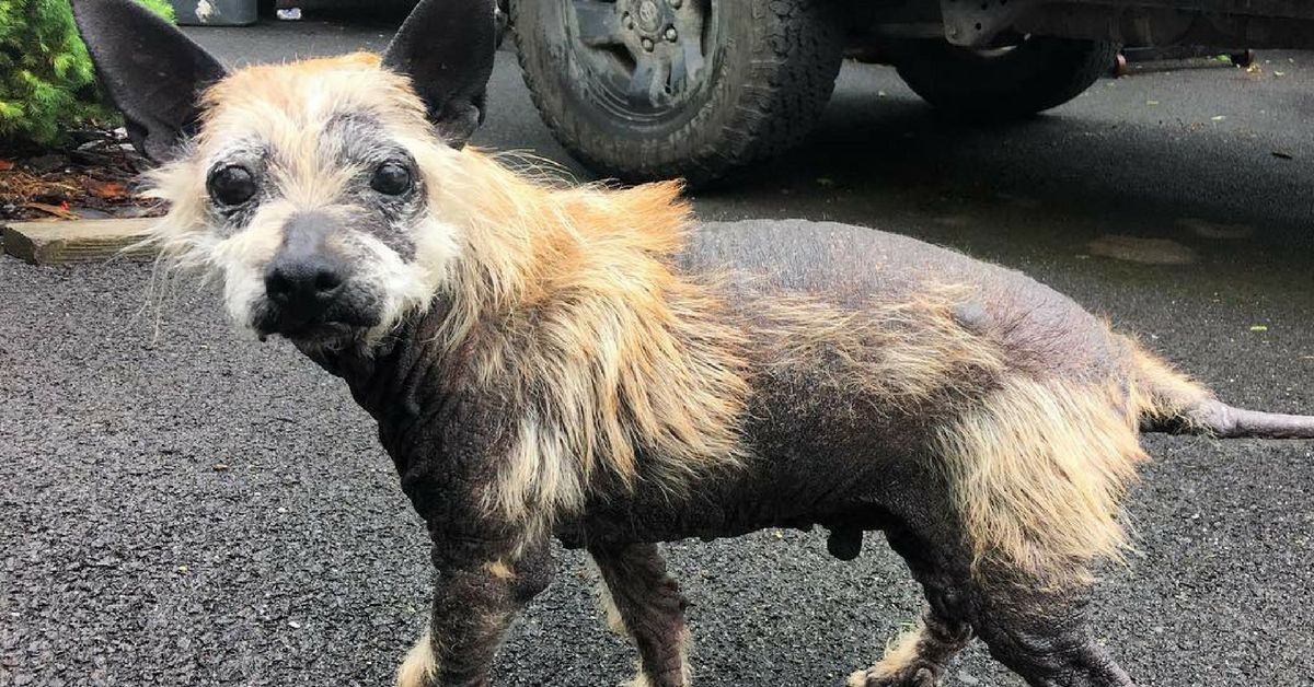 Abandoned dog looked more like a sick racoon but thankfully, one family stopped the car