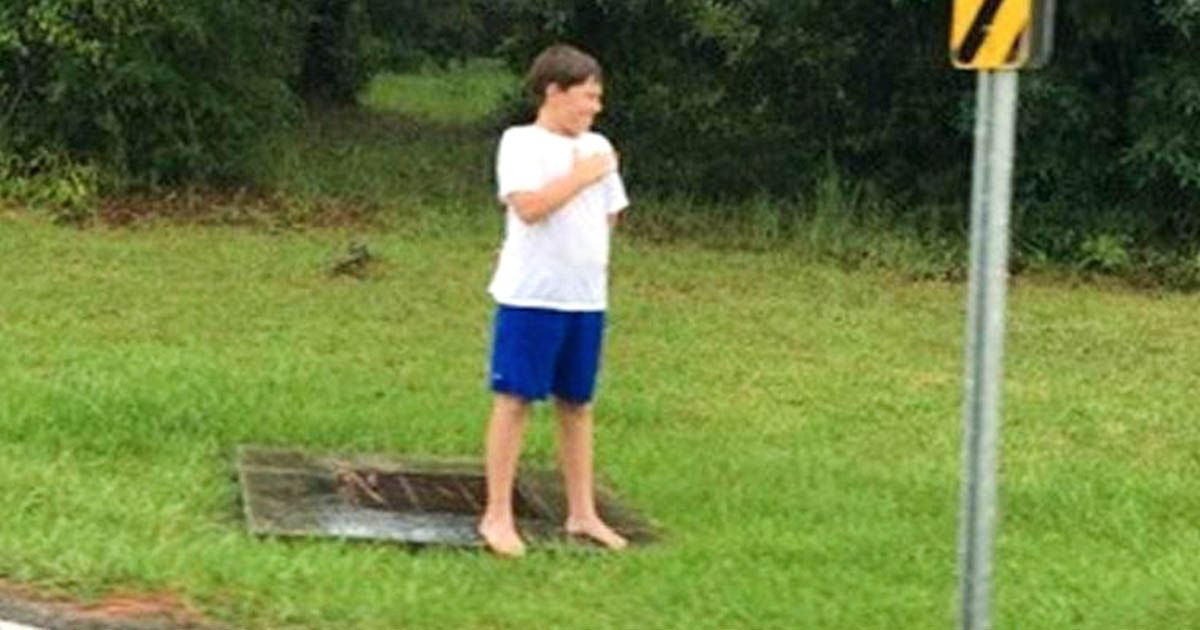 Boy stands barefoot in rain for 30 minutes for a reason that has everyone clapping