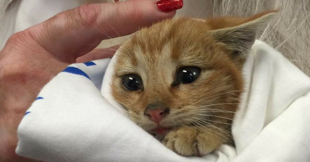 Tiny little ginger kitten was heard crying in dumpster. Thankfully, a couple came to its rescue