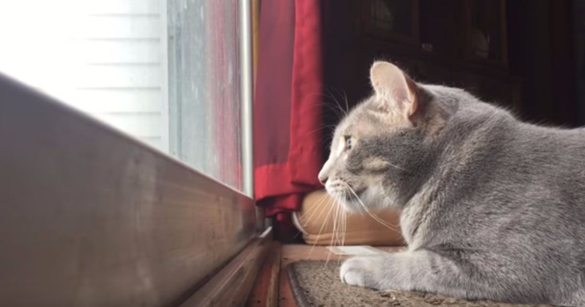 Owner catches cat mumbling to himself while hunting birds on the patio