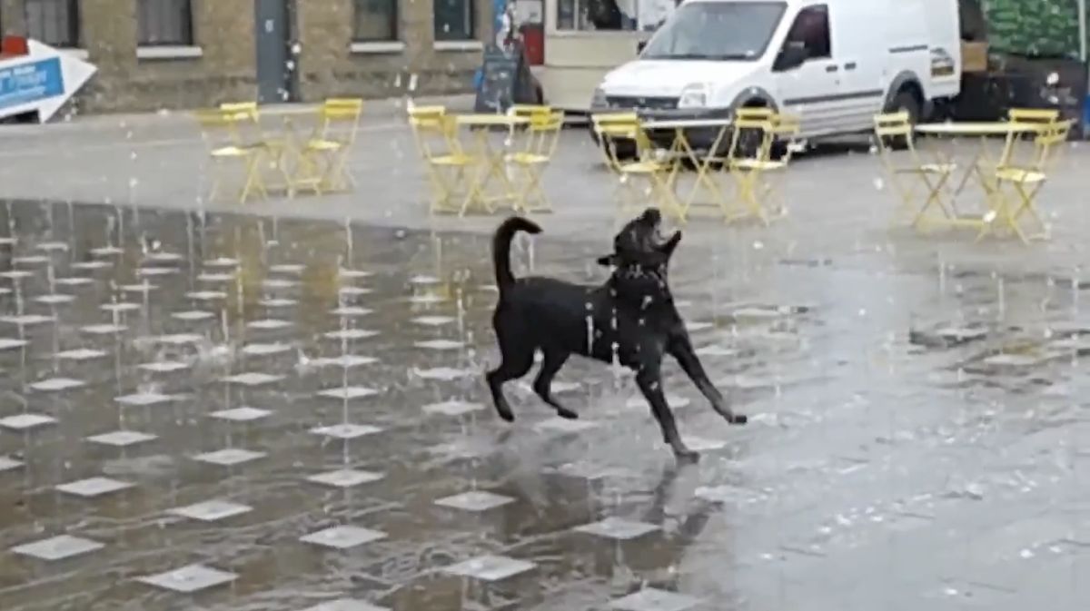 Adventurous dog has fun in water fountain