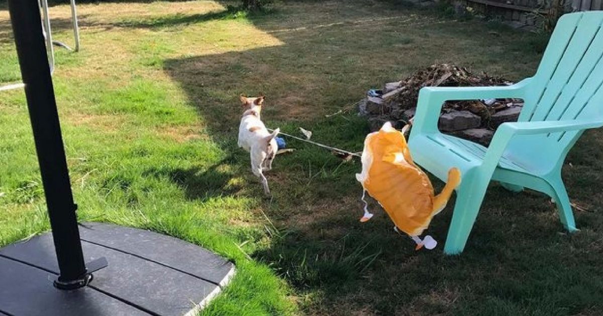 Jealous dog steals baby's cat balloon and takes it for strolls around the yard
