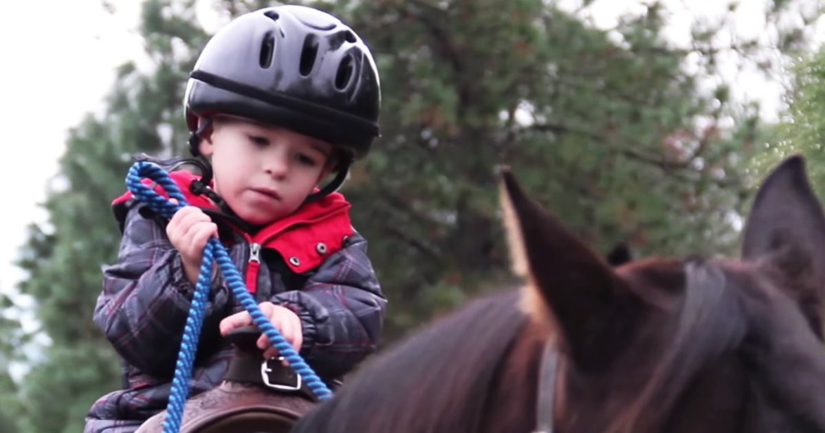 Small boy sits atop horse and holds reins for one inspiring reason